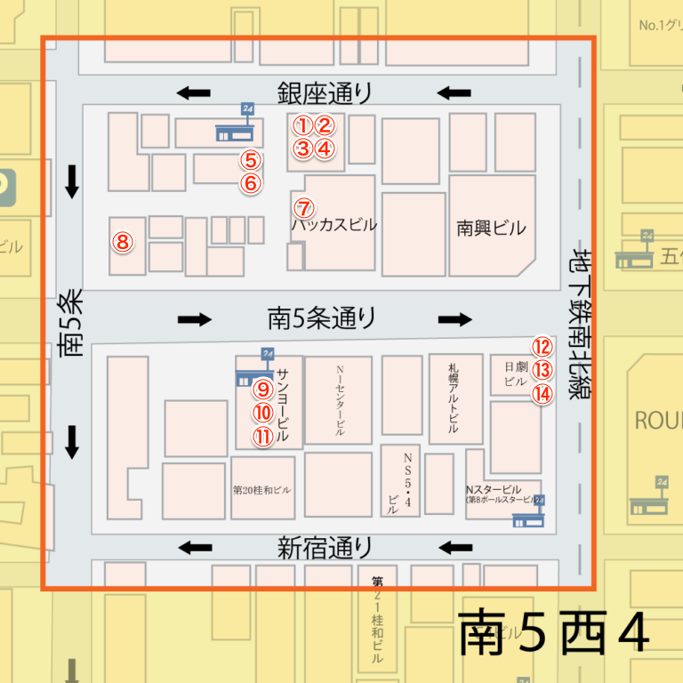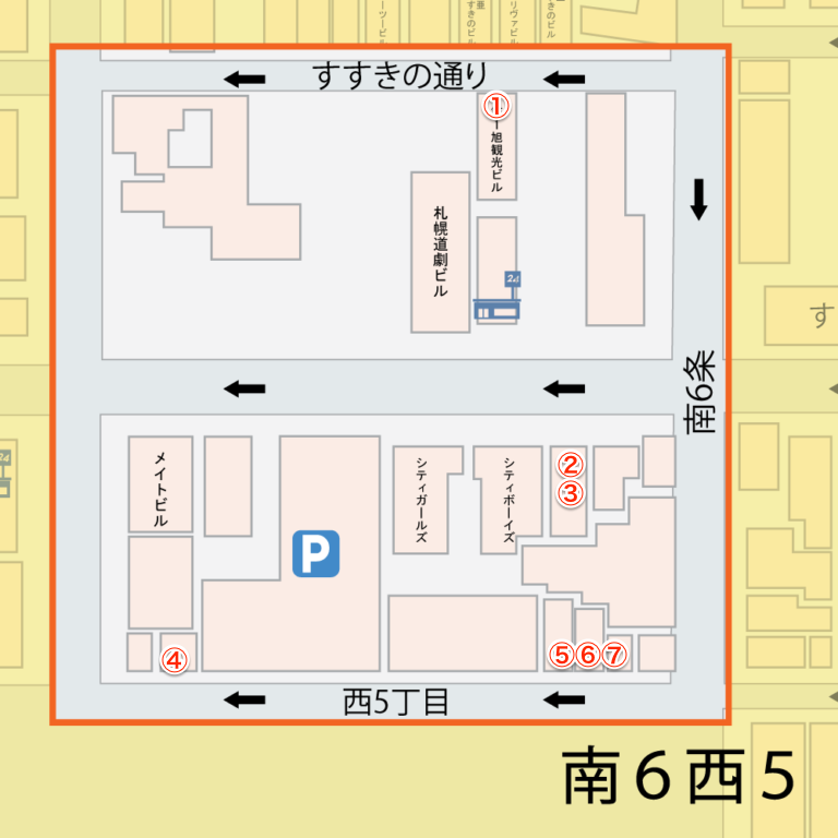 ・南5条西4丁目・・・全体図①と②に囲まれたエリア・南5条西5丁目・・・全体図③に囲まれたエリア・南6条西3丁目・・・全体図⑦に囲まれたエリア・南6条西4丁目・・・全体図④⑥に囲まれたエリア・南6条西5丁目・・・全体図⑤⑧に囲まれたエリア